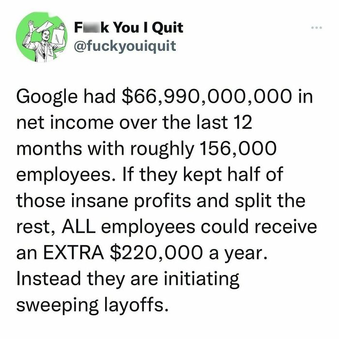 One of the main causes of all this suffering is that actual employees are not involved in planning company policy nor sharing in its profits. Many of these posts highlight the cases where a company will make record income and then turn around and fire its workers, cut sick days, or limit pay. In a tight labor market, bosses rely on the fact that people may struggle to find a new job so they won’t quit even as conditions worsen.