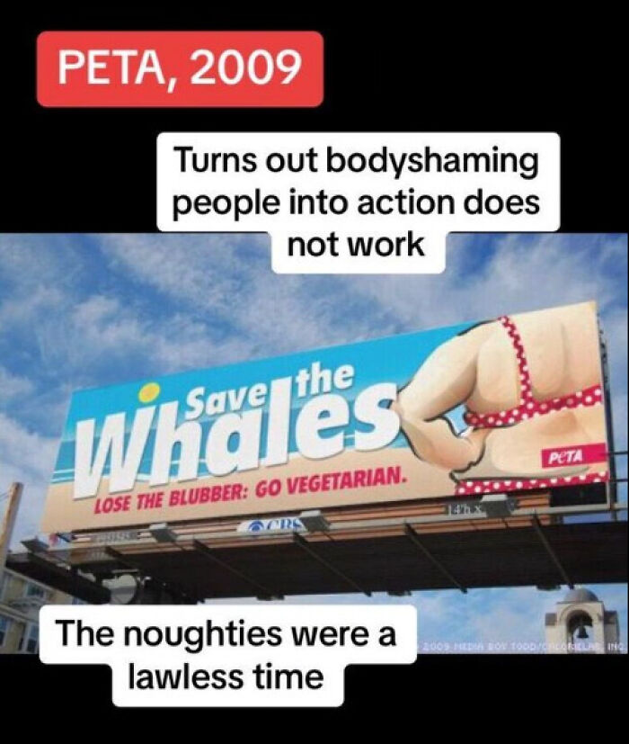 But just as Jennifer Aniston pointed out in her interview, the sensitivities have changed over time. Even at the end of the 2000s, PETA’s fatphobic “Save the Whales, Lose the Blubber: Go Vegetarian” ad was met with a strong negative reaction. The ad was taken down a month after being installed in Jacksonville, Florida.
