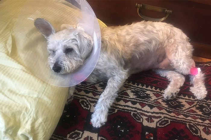 Dog had had surgery on both paws. Husband decided after a few days that he trusted him without the cone of shame. Arrived home to find bits of white cotton scattered down the hall. Followed them to find the living room floor covered in blood and the dog in his bed with a paw swollen to twice its usual size after he’d shredded the bandages and ripped out his stitches. Worst treasure hunt ever.