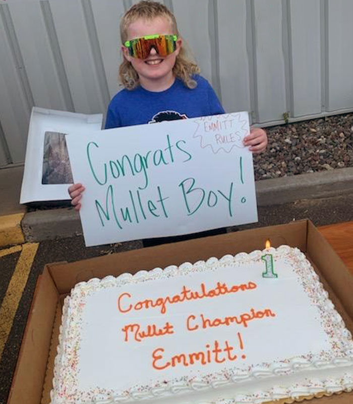 Out of 688 boys that entered, Emmitt received the most votes from mullet-lovers online—9,896, to be exact—and took home the cash prize of $2,500