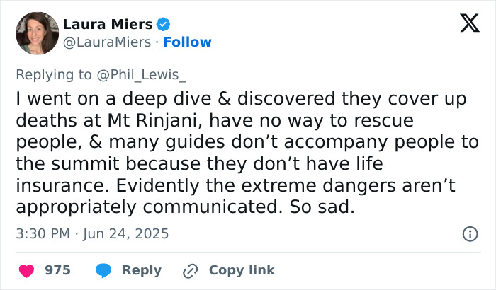 “I went on a deep dive & discovered they cover up de*ths at Mt Rinjani, have no way to rescue people, & many guides don’t accompany people to the summit because they don’t have life insurance,” an X user Laura Miers tweeted online.