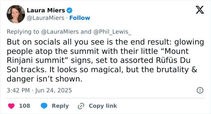 “On socials all you see is the end result: glowing people atop the summit with their little ‘Mount Rinjani summit’ signs, set to assorted Rüfüs Du Sol tracks,” she wrote. “It looks so magical, but the brutality & danger isn’t shown.”