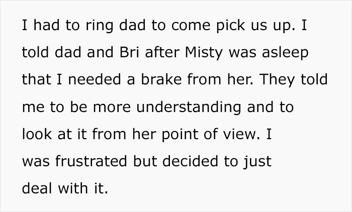 Along the way, Misty got pregnant, and the OP’s parents asked if she could hang out with Misty. The OP didn’t mind, well, until the pregnancy hormones kicked in. Misty became very moody and clingy. Even when she asked for a break, her parents told the OP to be more understanding of Misty’s situation. This carried on until the OP’s friend invited her to a birthday party, and Misty wanted to come along, even though she was not invited. When this was revealed to her, she broke down. The OP’s dad and stepmother gave her two options: ask her friend if Misty could go or keep Misty company.