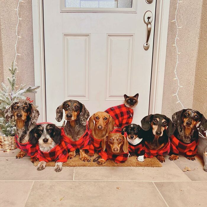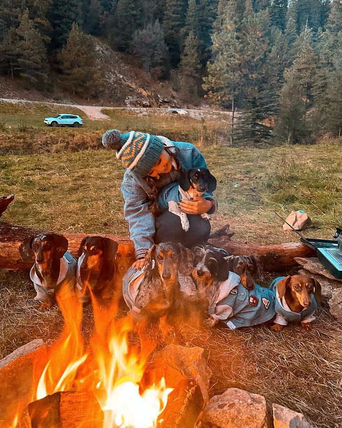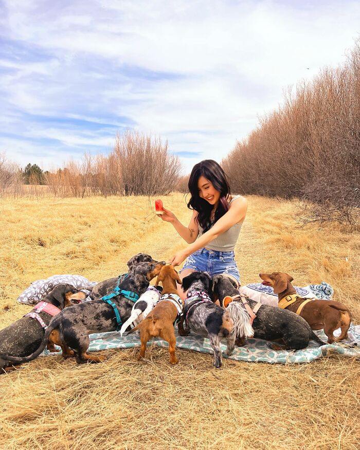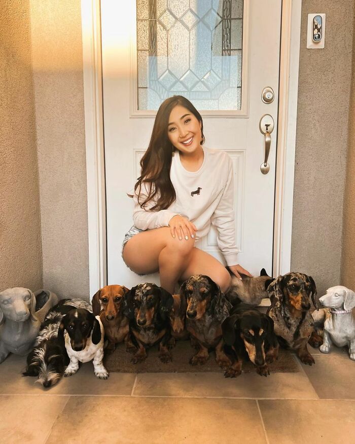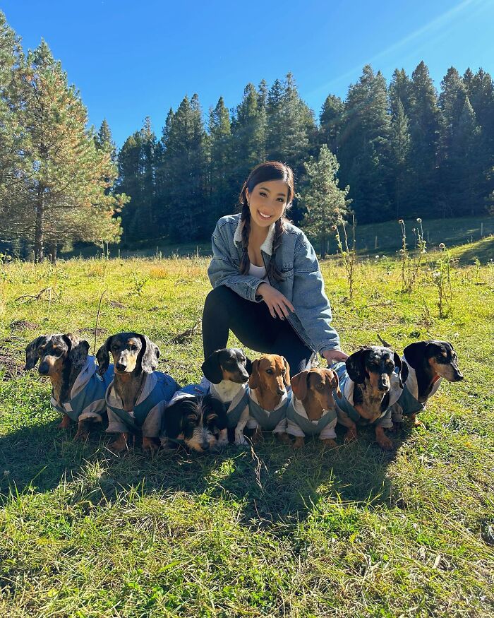 Yuna not only adopted these cute dachshunds but also shares on the internet what life is like with 8 dogs. Oh yes, and a cat. While it may seem like chaos to us, they are a lot of fun, and Yuna takes them everywhere.