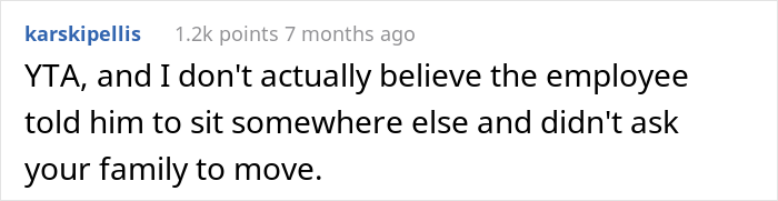 But the people in the comments had only one opinion – the passenger paid for his seat, so the OP was supposed to give it to him, as the rules are the same for everyone. The commenters were surprised – after all, if, according to the OP, the car was not full at the beginning of their trip, why did she and the children necessarily take the reserved seats?