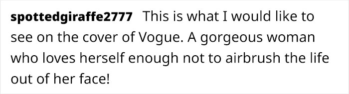 “Some days, I like it. I feel like my face has gained character even as it’s lost its youthful prettiness. And it seems a fair trade-off. Other days, (and this is mostly only if I do a photoshoot), I have to gulp some self-acceptance. I have changed.”