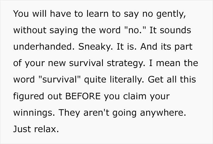 The redditor revealed exactly the type of negative impact this has had on previous winners, and outlined a plan of action to protect you and your newfound treasure hoard, and to help you secure generational wealth. It is basically a detailed how-to guide on what to do, what to avoid doing, and how to keep your sanity. You’ll find their legendary comments below, dear Pandas. Scroll down and have a read—this is one post that you definitely don’t want to miss.