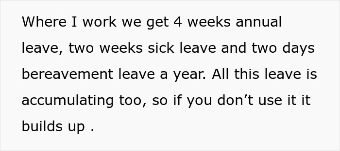 If you’re reading the story and wondering where you can get so many paid days off, it is Australia, according to some knowledgeable commentators. It’s also quite ridiculous that the company wouldn’t give out the PTO because they needed proof that someone’s relative has died.
