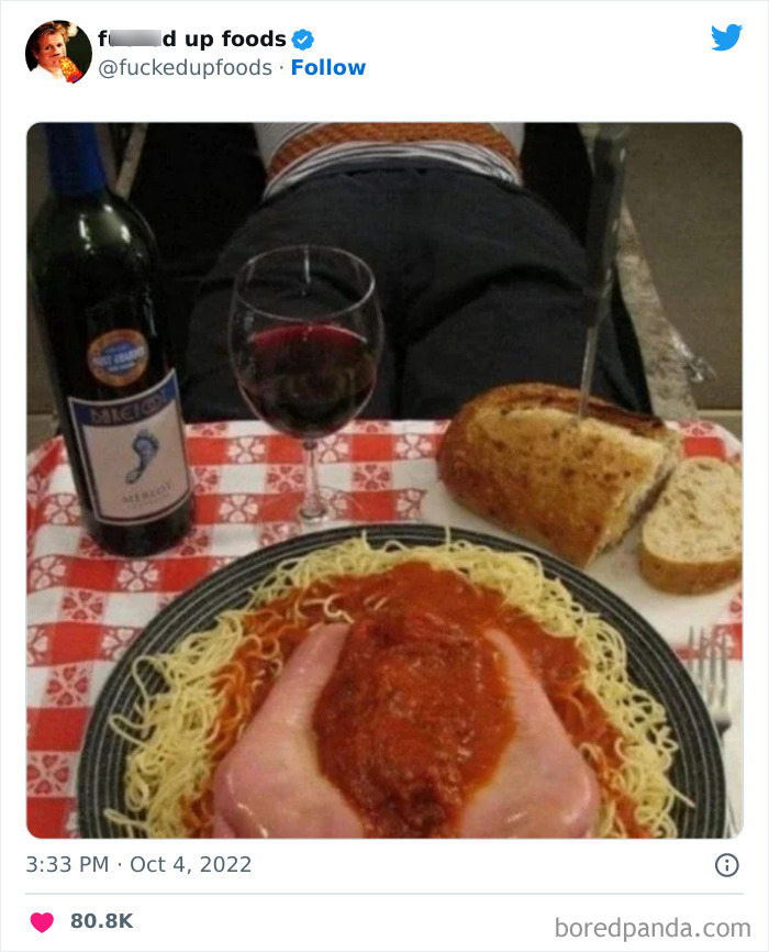 We don’t just experience good with our taste buds. We feel its texture in our mouths, we smell it in our nasal canals, and we eat it up with our eyes before ever taking a bite. On this last step, however, there are some meals out there that fail spectacularly, and for all of them, there is a wonderful Twitter that is waiting to share them with the world.