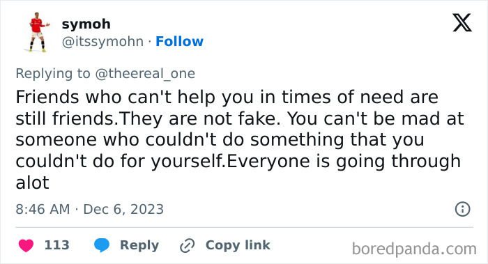 The responses folks gave included the classics (“You don’t know your friends until you’re in need of support.”), the contemporaries (“Your friends don’t need to know everything about you.”), and the truths that never get old (“Learn how to fix things.”). All in all, the thread went viral with 8,000 likes and reshares as well as over 80 million views.