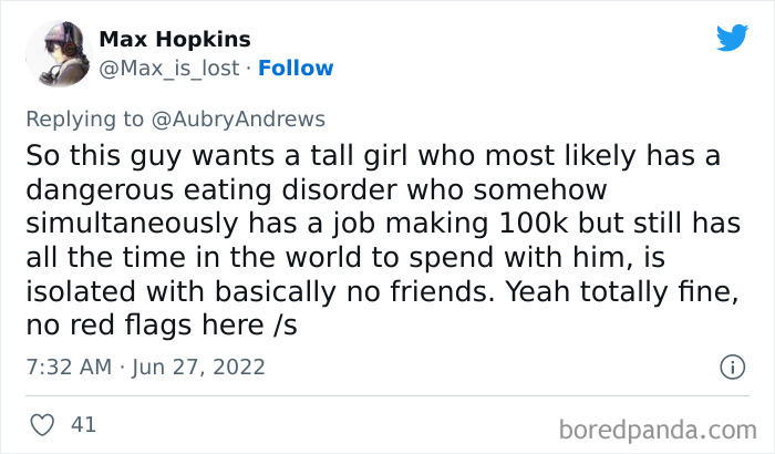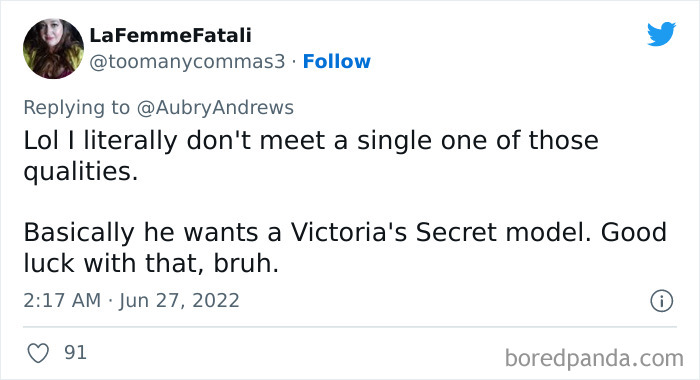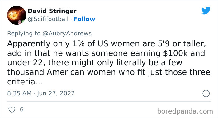 Internet personality Aubry Andrews recently tweeted a screenshot of a guy’s online dating profile. The self-described open-minded fellow had 14 demands for women, many of which were contradicting each other. For example, his perfect candidate must make at least $100K but at the same be available 6 days a week.