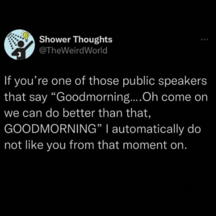 #59 Normalize Public Speakers Who Say “Good Morning” And Then When The Crowd Says “Good Morning” The Speaker Says “Oh No, That Was Way Too Much. Over The Top. Can We Try This Again But Please Be A Bit More Subdued?”