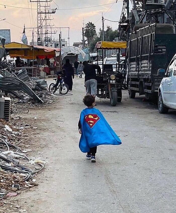 A young Palestinian boy, having witnessed more terror than most adults beyond Gaza ever will, wanders the streets dressed as Superman.