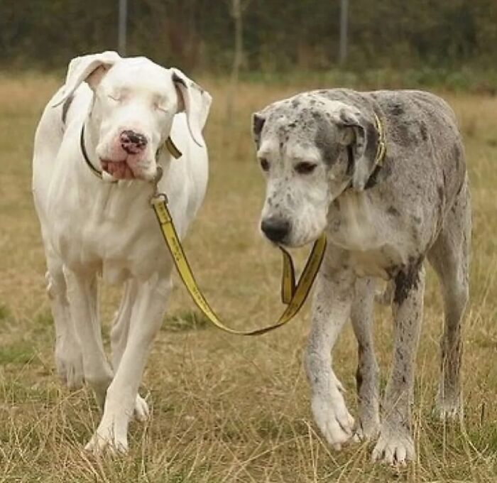 Lily, a blind Great Dane, is with her guide dog, Madison. Lily became blind after an illness that required the removal of both her eyes, and Maddison, another Great Dane, became her loyal guide and best friend, helping her navigate the world despite her blindness.