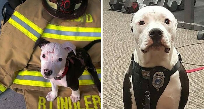 At just three weeks old, a puppy named Jake was rescued from a burning shed by firefighter Bill Lindler, though he suffered burns on 75% of his body. After his owners abandoned him at the vet, Lindler adopted Jake, who made a remarkable recovery. Jake now teaches kids about fire safety, proudly wears a working dog badge, and has become the official mascot of the Hanahan Fire Department.
