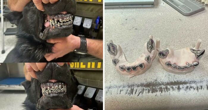 This K-9 unit named Deke was given titanium teeth caps to extend its service life. The work was needed on the 6 years old german shepherd due to his natural teeth becoming worn down over his years of specialized service in narc*tics and apprehension.
