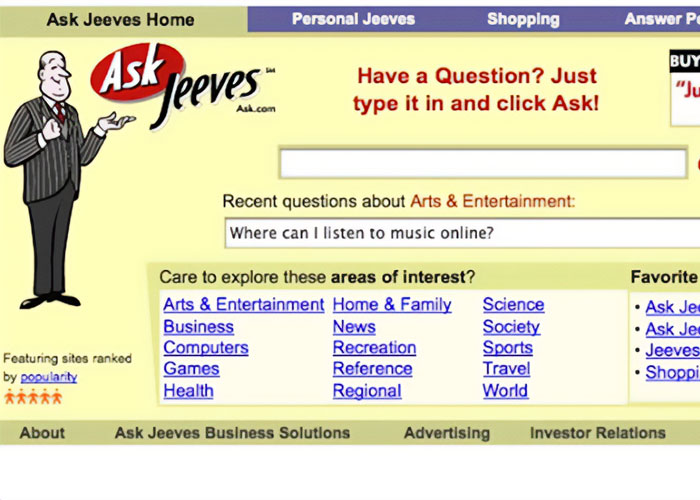 Although other search engines like Yahoo! and Alta Vista were already popular, Ask Jeeves stood out with its quirky butler character. Why did people stop asking Jeeves? When the dot-com bubble burst in 2000, advertisers fled from web development. The company reportedly lost $425 million, and in the coming years, Jeeves morphed into Ask.com.