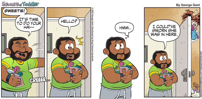 After a few years (and many failed webcomics), I created Beware of Toddler nearly on a whim. My then nearly two-year-old daughter did something I thought was funny, so I drew it as a comic strip. As soon as I posted it online, it instantly gained attention. People gravitated to this simple comic strip about a dad hiding in the closet, so I drew another one. And another one. And now I’m approaching number 300. Since then, Beware of Toddler has won two awards, been nominated for several more (including a Ringo!), and is currently distributed by King Features Syndicate. There was also a printed book collection successfully crowdfunded on Kickstarter in 2022.
