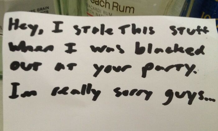 “Hey, I stole this stuff when I was blacked out at your party. I’m really sorry guys…”