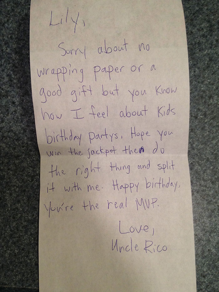 #23 My Brother-In-Law Wrapped This Note Around Some Lottery Tickets And Gave It To My 9-Year-Old For Her Birthday
