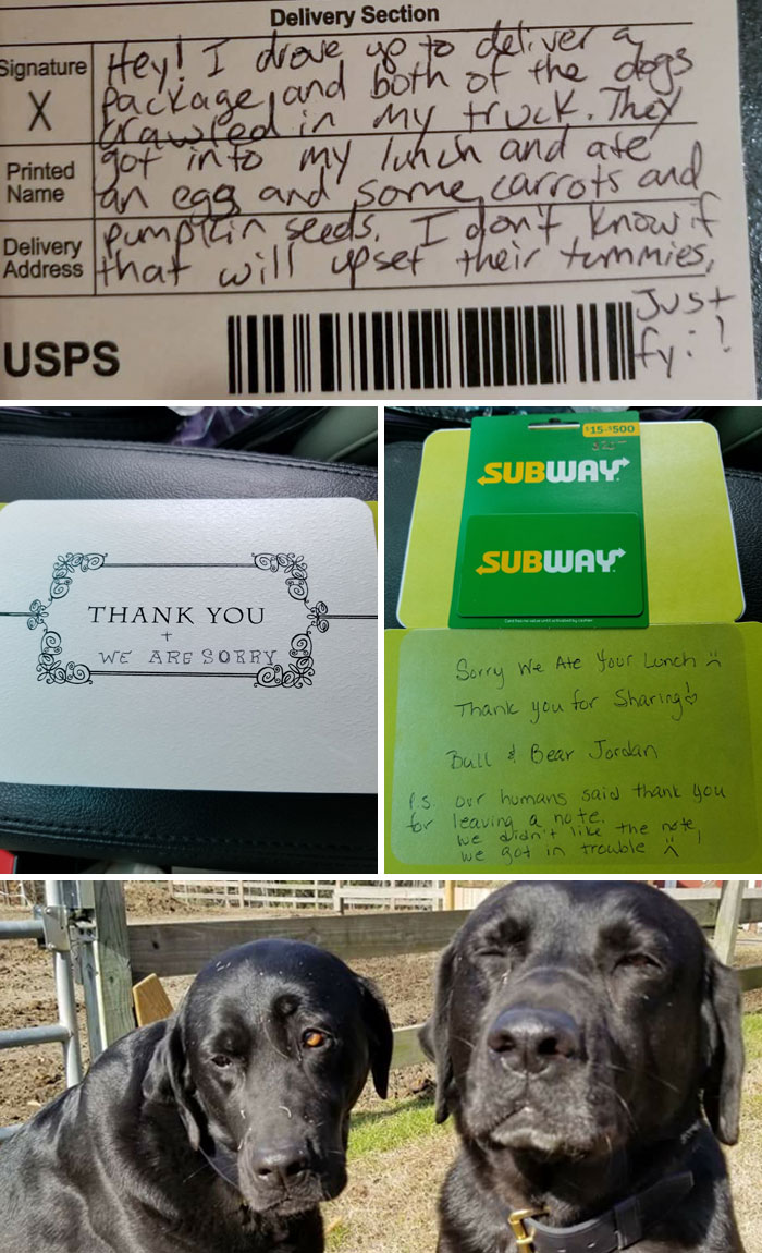 #1 Two Dogs Couldn’t Resist Eating The Mail Lady’s Lunch, Then Wrote Her This Note
