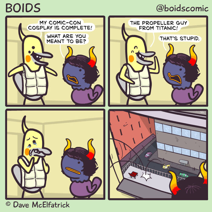 Dave McElfatrick is an Irish cartoonist from County Derry whose work has become instantly recognizable online thanks to its deceptively simple style and razor-sharp humor. He is one of the co-creators of the long-running webcomic "Cyanide & Happiness" and the creator of "Boids," a series that distills dark thoughts, social absurdities, and pop culture commentary into minimal yet striking one-panel jokes.