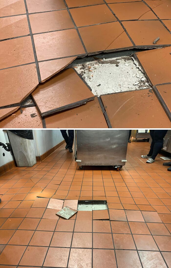 #30 Commercial Kitchen. Over The Last 8 Hours All These Tiles Raised Up And Actually Cracked. No Gas Line Or Water Leaks Underneath. The Tiles Were Installed 2009. Is This Just Tiles That Need To Be Reinstalled?