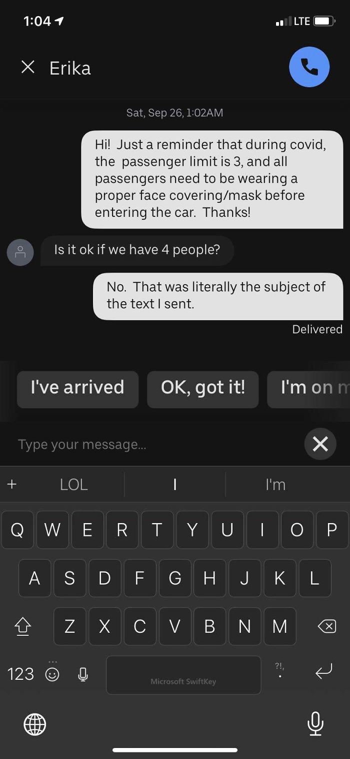 #10 I Drive For Uber, And Since No One Pays Attention To The Covid Notices When They Book The Ride, I Started Sending Everyone This Advance Pickup Message. It’s Not Working Like I’d Hoped