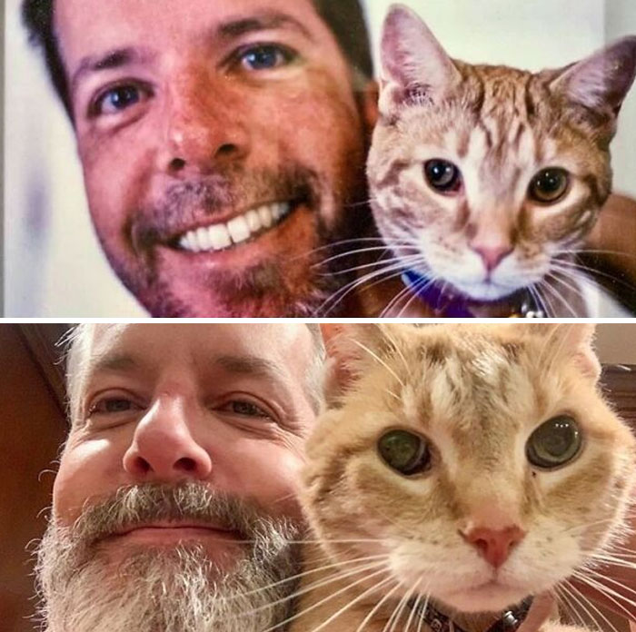 #4 My Dad When He First Adopted My One-Year-Old Blind Cat Cheddar, And Them Together On Cheddar’s Eighteenth Birthday!