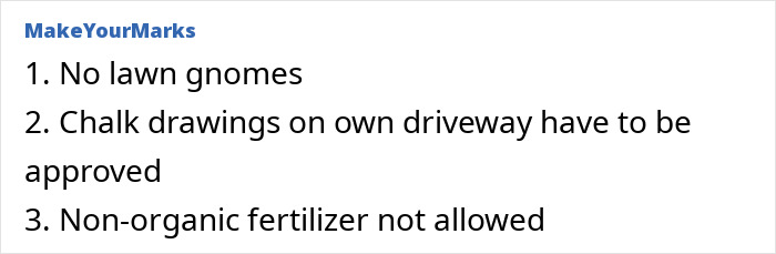 To show just how wild things can get, the Bored Panda team went digging and found some examples that might actually make you feel grateful for your own neighborhood rules. Keep scrolling to see just how far some HOAs have taken it.