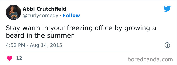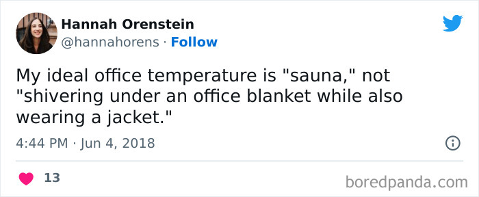 The result is that many of us are starting to learn the hidden dangers of an office, particularly in the summer. It’s not the hot sun that gets you, it’s the oppressive, ever-blowing air conditioning units. So enjoy this collection of officer workers lamenting the cold and be sure to upvote your favorites.