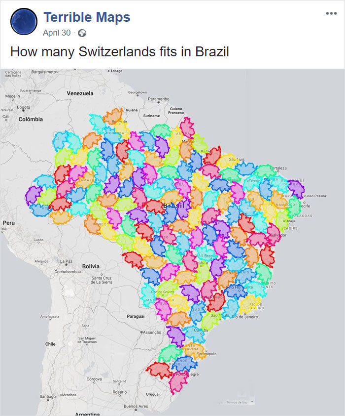 However, some cartographers try to mix it up and stray from the norm, creating not-so-conventional maps that, at first glance, have no usefulness at all. How many Switzerlands fit in Brazil and tomato Europe vs. potato Europe are just a few examples awaiting you on the best-of-all-time list of Terrible Maps. Scroll down to find them, and don’t forget to upvote the ones you think failed at geography the most!