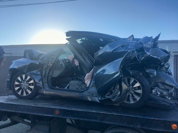 She was not wearing her seatbelt and through the first roll was partially ejected out the drivers side window. Her skull was crushed between the outside of the door and the road; and continued to flop partially ejected as the vehicle rolled. The skull was split from her left eye to the right rear behind her ear. This caused her brain matter to be strewn about the road and car. Her body was eventually thrown from the vehicle and came to rest on the side of the road.