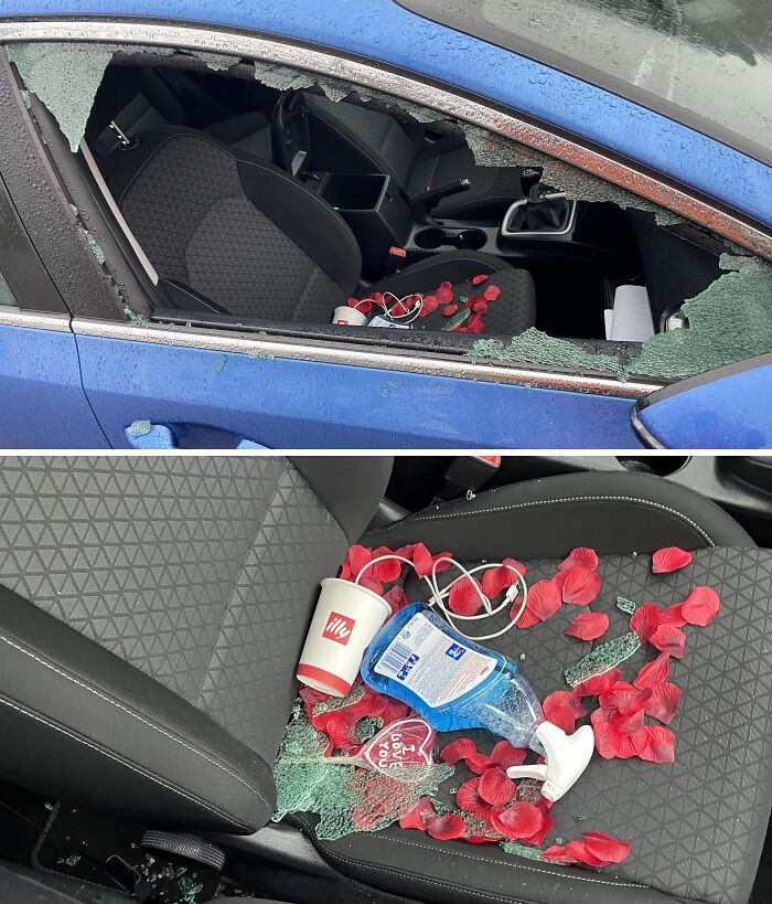 My girlfriend left a gift in the car for me yesterday to find this morning when I went to work, but instead, I found a smashed window.