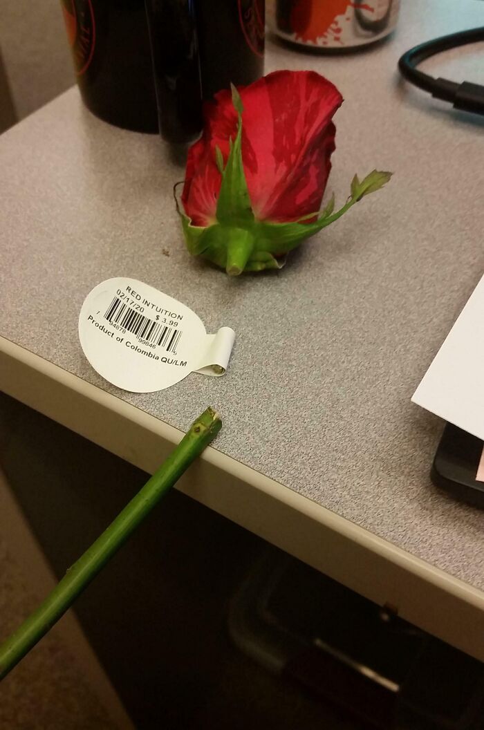 #33 Bought A Single $4 Rose To Brighten Up My Desk For Valentine’s Day, And Tried To Remove The Inexplicable Tag