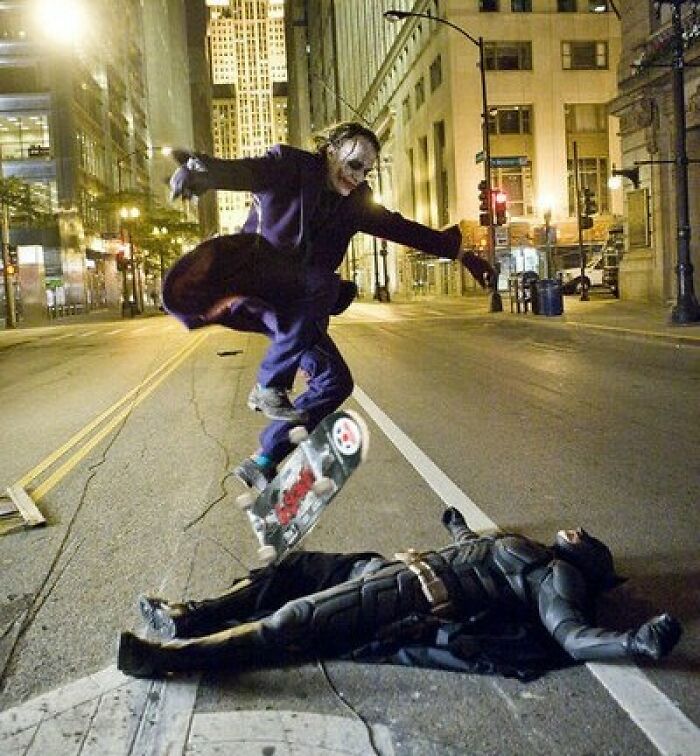This one. Heath ledger skateboarding as the joker over Christian bale as batman on the set of dark knight. It’s a photoshop as a simple google search will show, and everyone thinks it’s real.