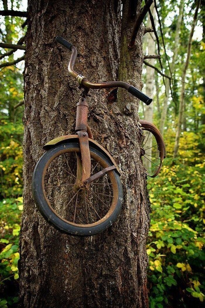 The story: “A boy left his bike chained to a tree when he went away to war in 1914. He never returned, leaving the tree no choice but to grow around the bike.”