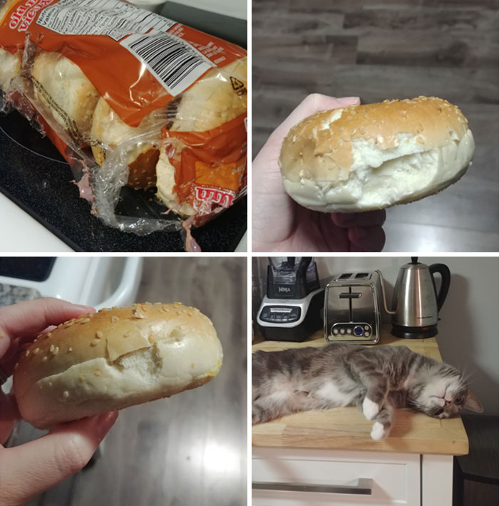 #33 The Cat Was Mad We Weren’t Home To Feed Her Dinner, And Got Back At Us By Ripping Apart A Pack Of Bagels And Taking A Tiny Bite Out Of Each One