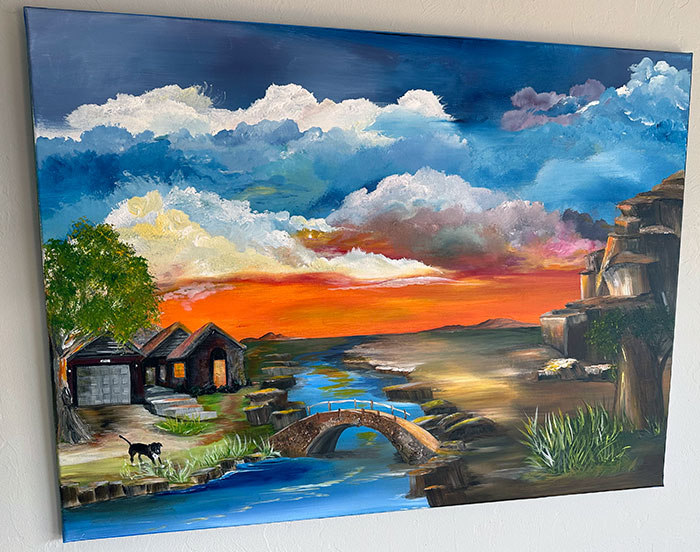 #25 My Mother Is 67 Years Old And Learned How To Paint From Watching Bob Ross. She Is Painting My Siblings And Me Canvases Of Our Homes. She Even Included My Dog Jax