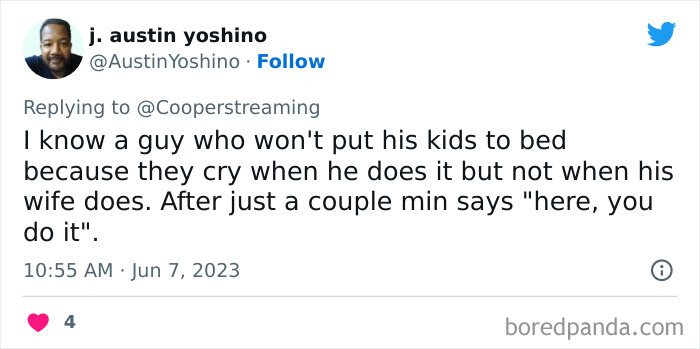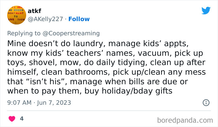 Cooper also told Bored Panda that one story in particular from the thread stuck out to her. “One woman said her dad told her brother, right in front of her ‘Just pretend you don’t know how to do laundry and your sister will do it for you.’ Despite the level to which this is predictable, it still somehow felt shocking,” she shared. “There are a lot of people who pretend they don’t do this, or know anyone who does, and yet here was a man actively teaching his son how to feign ignorance to manipulate women into doing his work.”