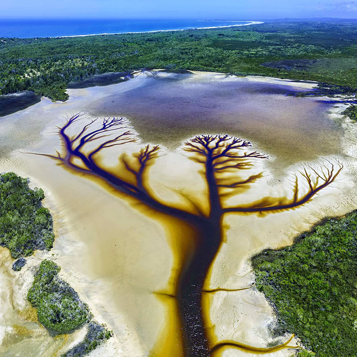 This is at the end of lake Cakora in brooms head. It happened after the storm at the beach side of the lake broke out. It drained most of the water. As it drains out a connecting lake with tea trees on the banks, the high tides push the tea tree oily water back up the lake to create these stunning natural masterpieces.