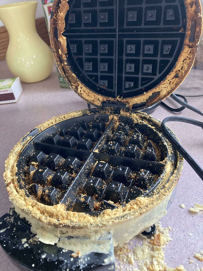 #44 A Friend Came Over And Started Making A Waffle But Forgot About It, Then They Left The Iron Like This For Me To Clean Up. This Is After 30 Minutes Of Careful Scraping