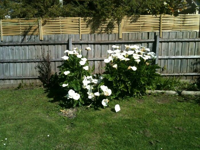 This is my grandmother’s backyard. Her inconsiderate neighbour asked to access her yard so he could hammer in the extensions on this side of his fence. Instead of walking around the plant, which is not flat against the fence, he trudged a path right through the flowers.