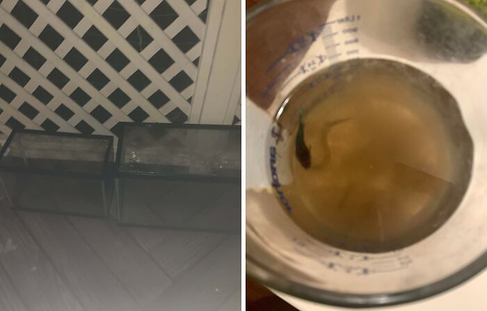 My parents came over to visit for a few days and saw how messy my bedroom was. I was out today and came home to this. The tanks were completely empty, and my fish were put inside a measuring cup.