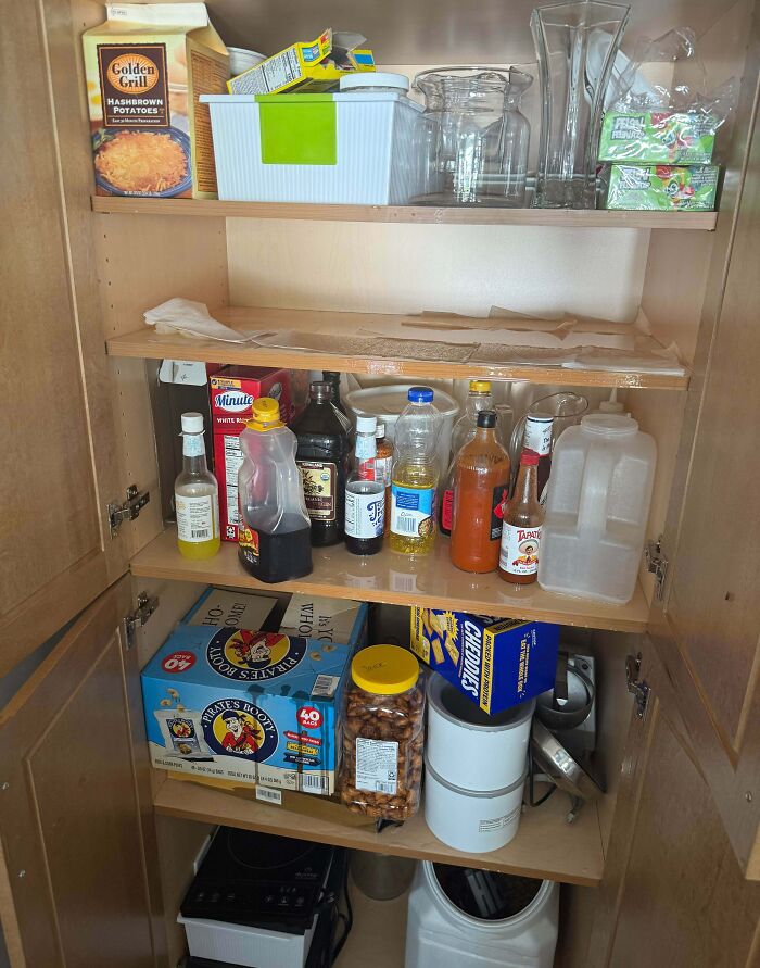 My wife and I just returned from a week-long vacation to find our kitchen literally rearranged. We asked her parents to just drop by and feed our rabbits while we were away. Something they’ve done numerous times and are always paid to do when needed- This vacation was fairly needed, as I’m in the middle of attending postsecondary and working part-time while my wife works full-time and takes care of the house, while I pitch in where I can. And after a 4-hour car ride, we are extremely thankful for this break and look forward to preparing for another year of endless work. But lo and behold, her parents left us another hour’s worth of work for us to even use the kitchen, as a joke. My wife is more upset than I am, but it certainly drew an annoyed snort from me, which I believe qualifies as mildly infuriating. The picture is just one of several cupboards.