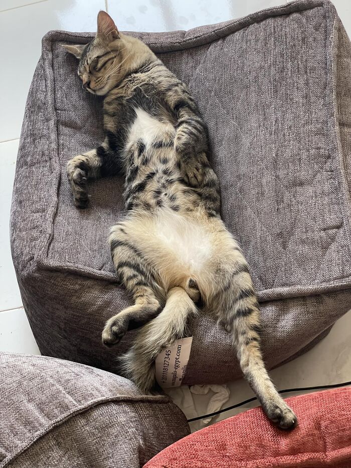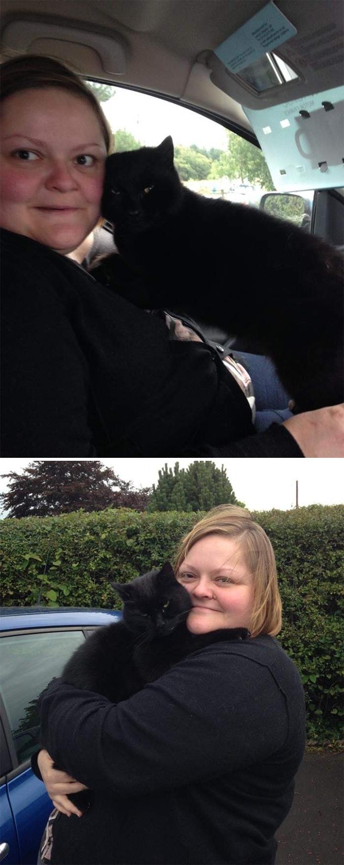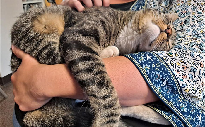 Climbed into the car when we pulled up, walked straight across my husband’s lap and cuddled up to me. Suckled on my cardigan while making biscuits on my neck. Such a beautiful kitty .I did not want to let him go!