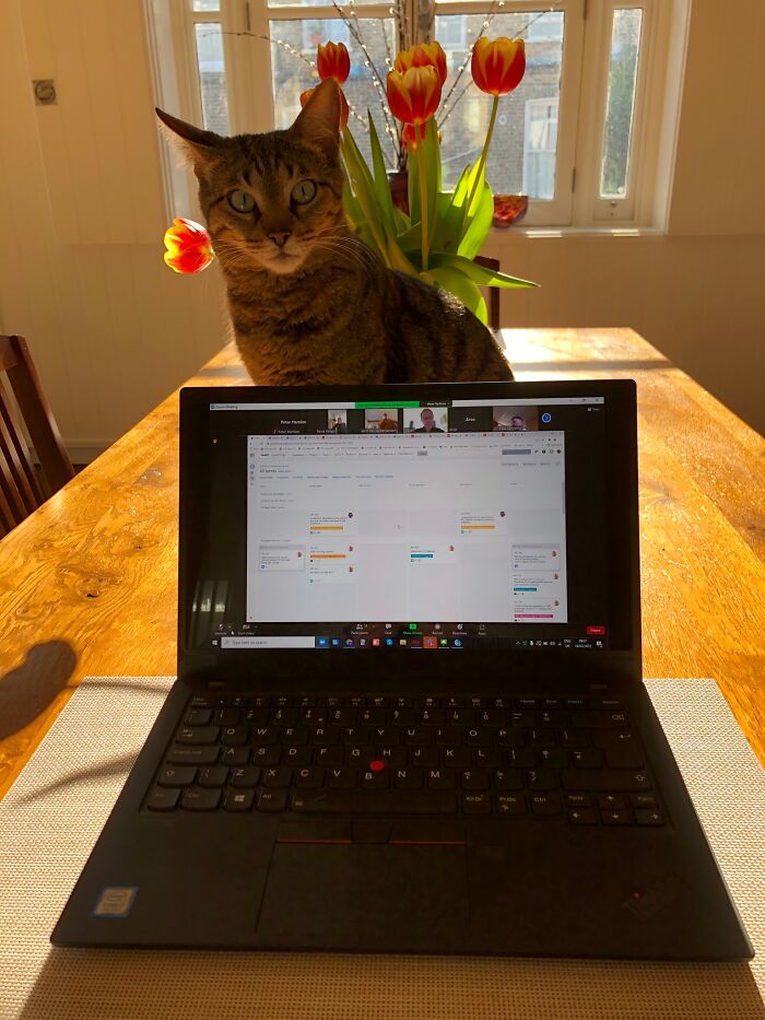 “This fellow has now learned to walk quietly behind me and sneak in when I open the door from my morning coffee run. This was my morning meeting … my colleagues commented “There’s a lot of meowing, Hamlen, for someone who doesn’t have a cat””
