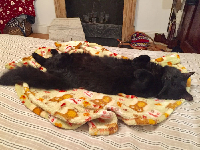 “… he just turned up and got straight onto the nearest heated cushion with built-in massage capacity (me). He then divided the night between me and my partner in our separate sleeping bags, demonstrating PhD-level expertise in getting under the covers to where it was really warm. I can fully recommend having a warm soft purry thing in the sleeping bag to enhance a night’s camping.