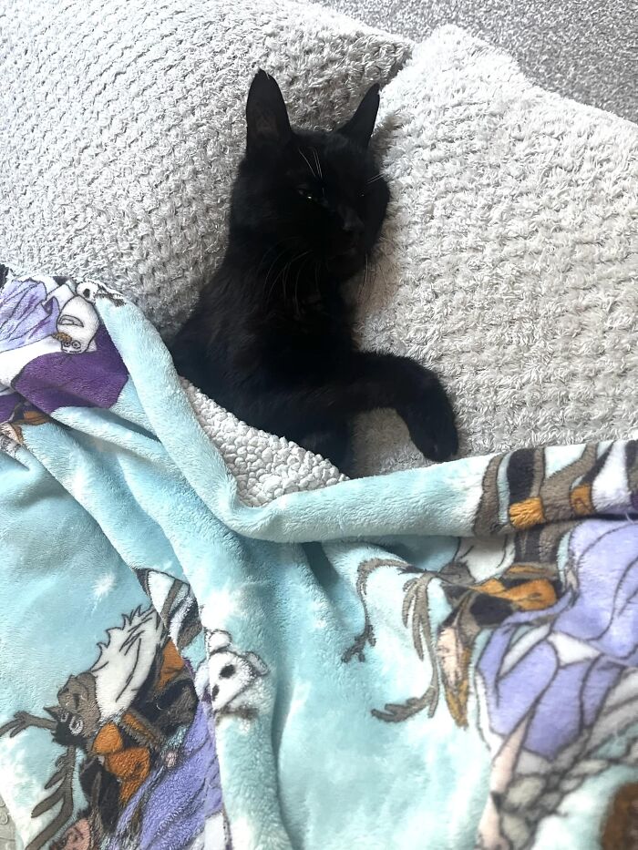 I recently moved to a new house. About a week or so of living here I was coming home from the grocery store so I propped the door open so I could carry in my groceries. As I was heading back outside I noticed a kitty run into my house so I got my last bags and took them to the kitchen quick and went to see where the cat went. I found him like this (the first pic) in my living room. So I gave him some pets and then ended up like this (2nd pic) for the next hour. He’s so sweet. He kept coming over every day to watch tv on my lap and then going to the door to leave when he was ready. He was wearing a collar but it had no tags so I decided to write a little note and attach it to the collar. I asked if he had a home and what his name was. The very next day he returned with a note back saying his name was Finn and his address which was 4 houses down & also a phone number saying to text if I wanted to so I did. We were texting about the cat on and off all day and then we came to realize that we actually knew each other from high school. Which I thought was hilarious. Anyways, I now share custody of Finn and he is just the sweetest boy and I look forward to seeing him every day!