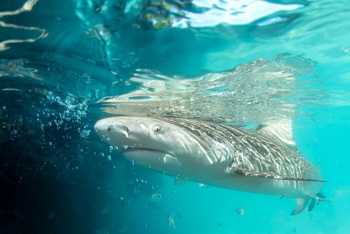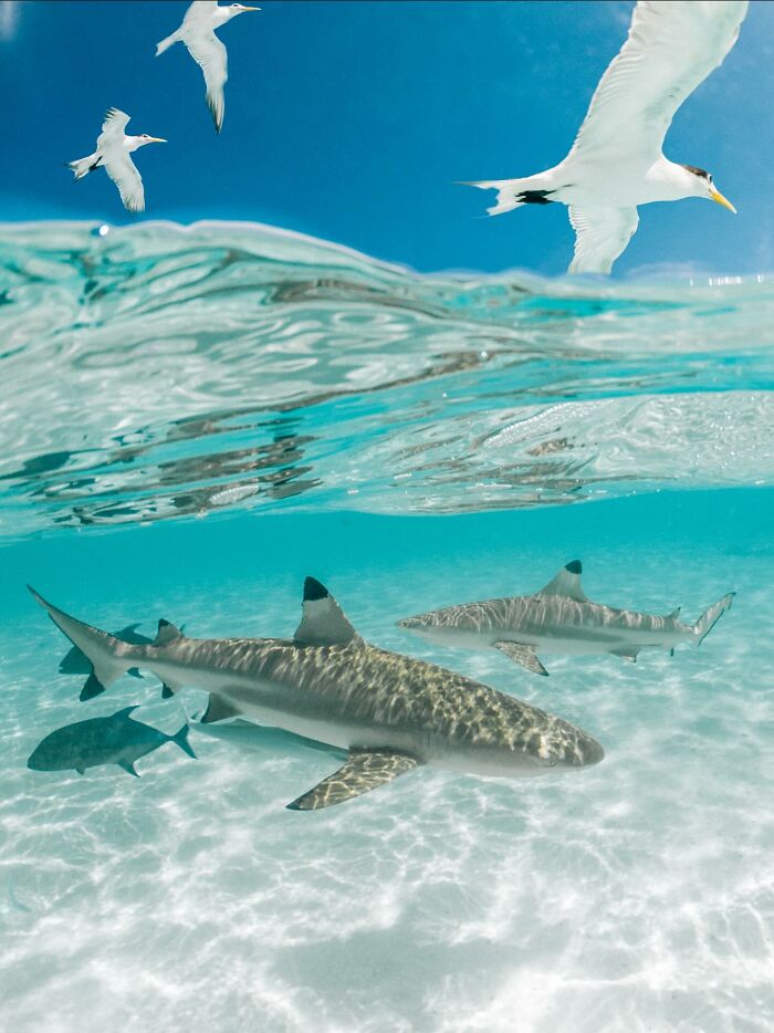 One photo in this list shows a scuba diver completely surrounded by fish — a scene often described by divers as a “living silver river.”
